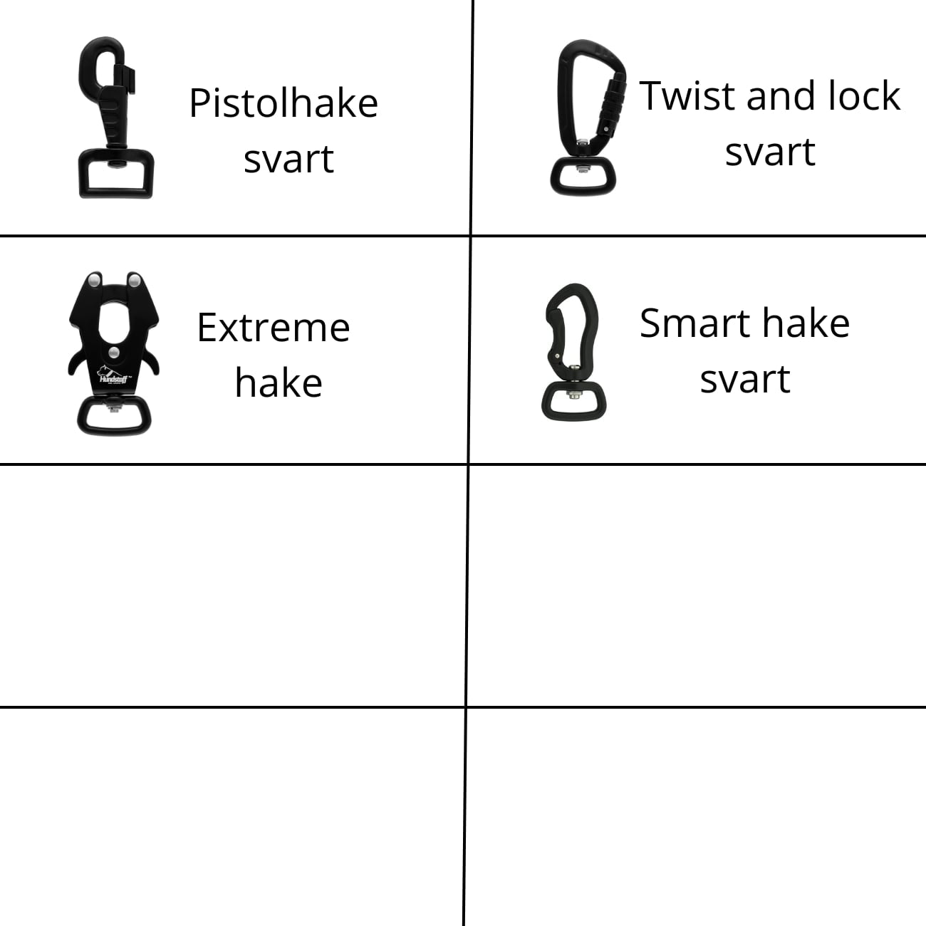 - Smart karabinhake (2.5x7 cm 25 g) Är en säker men mindre hake som väger mindre och passar bättre till mindre hundar. Tex. Staffar, Franska bulldogs, Bullterrier, Valpar, mm